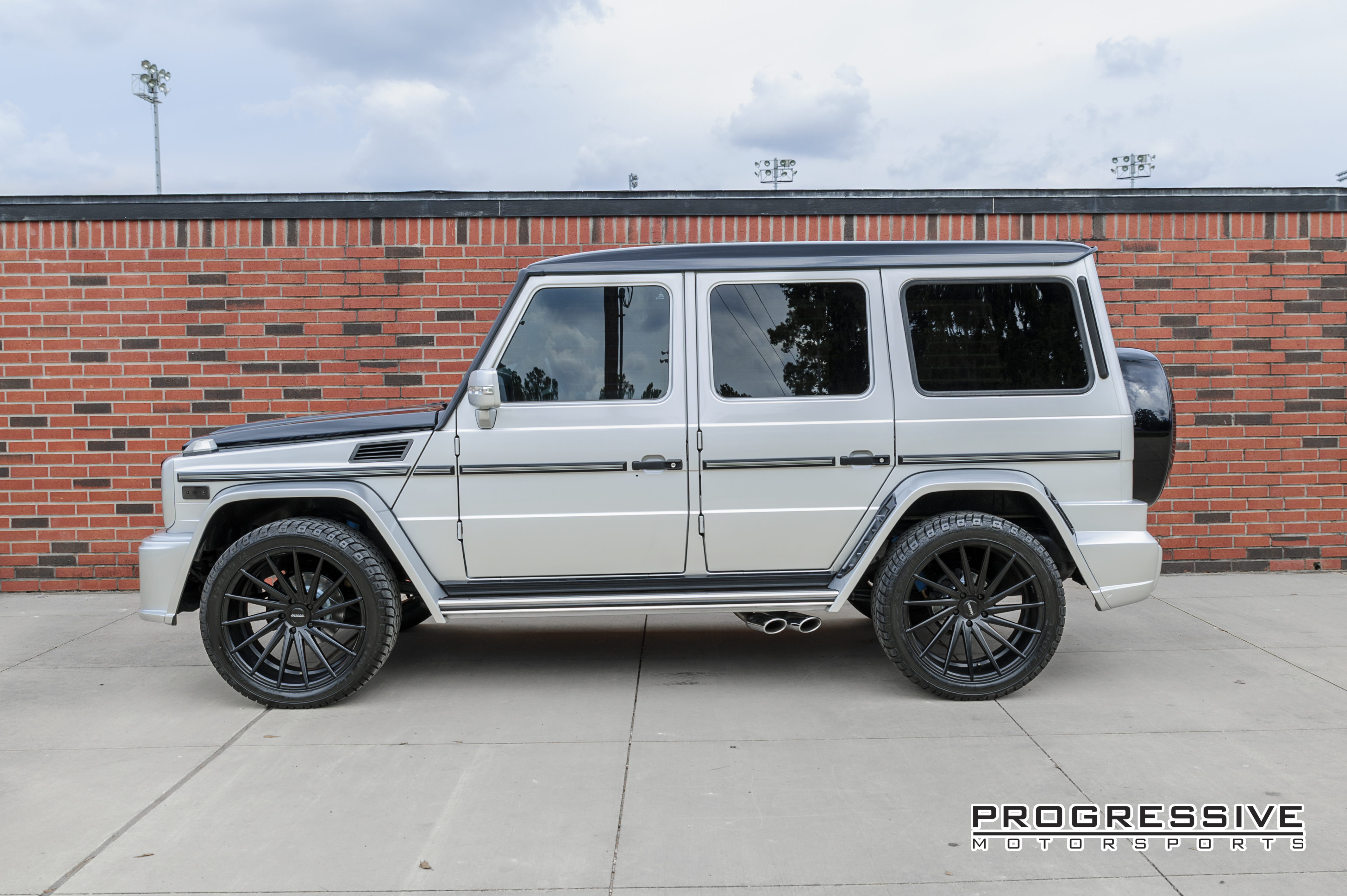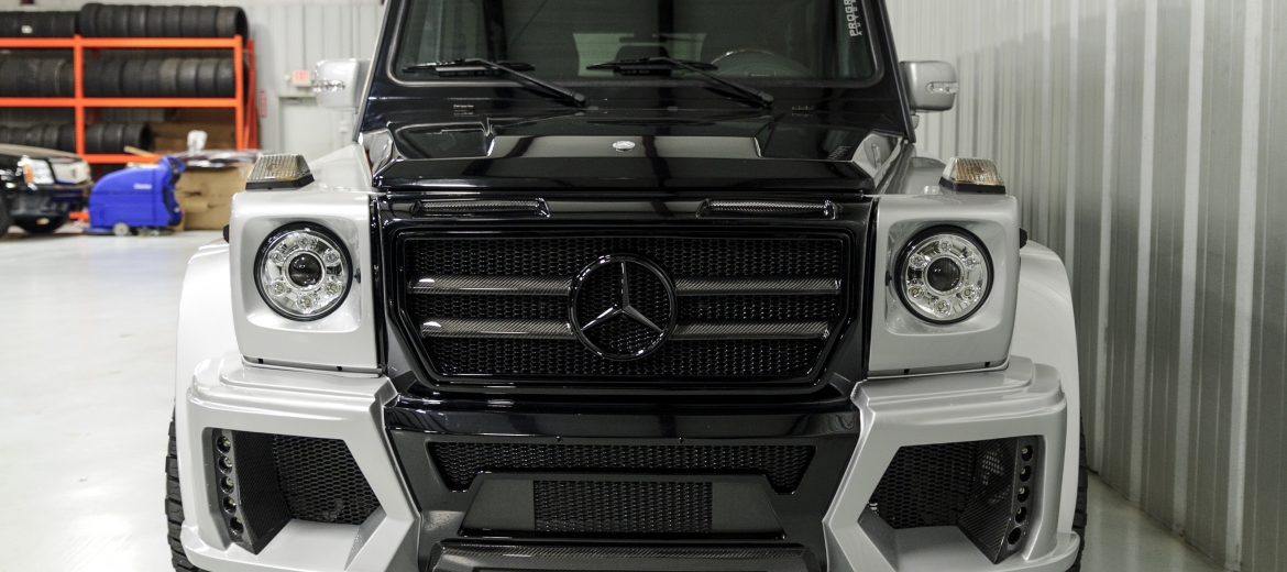 2004 Mercedes Benz G500 custom 2 tone paint custom wide body kit with carbon fiber accents 22×11 wheels with all terrain tires custom stitched interior custom sound system custom led headlights